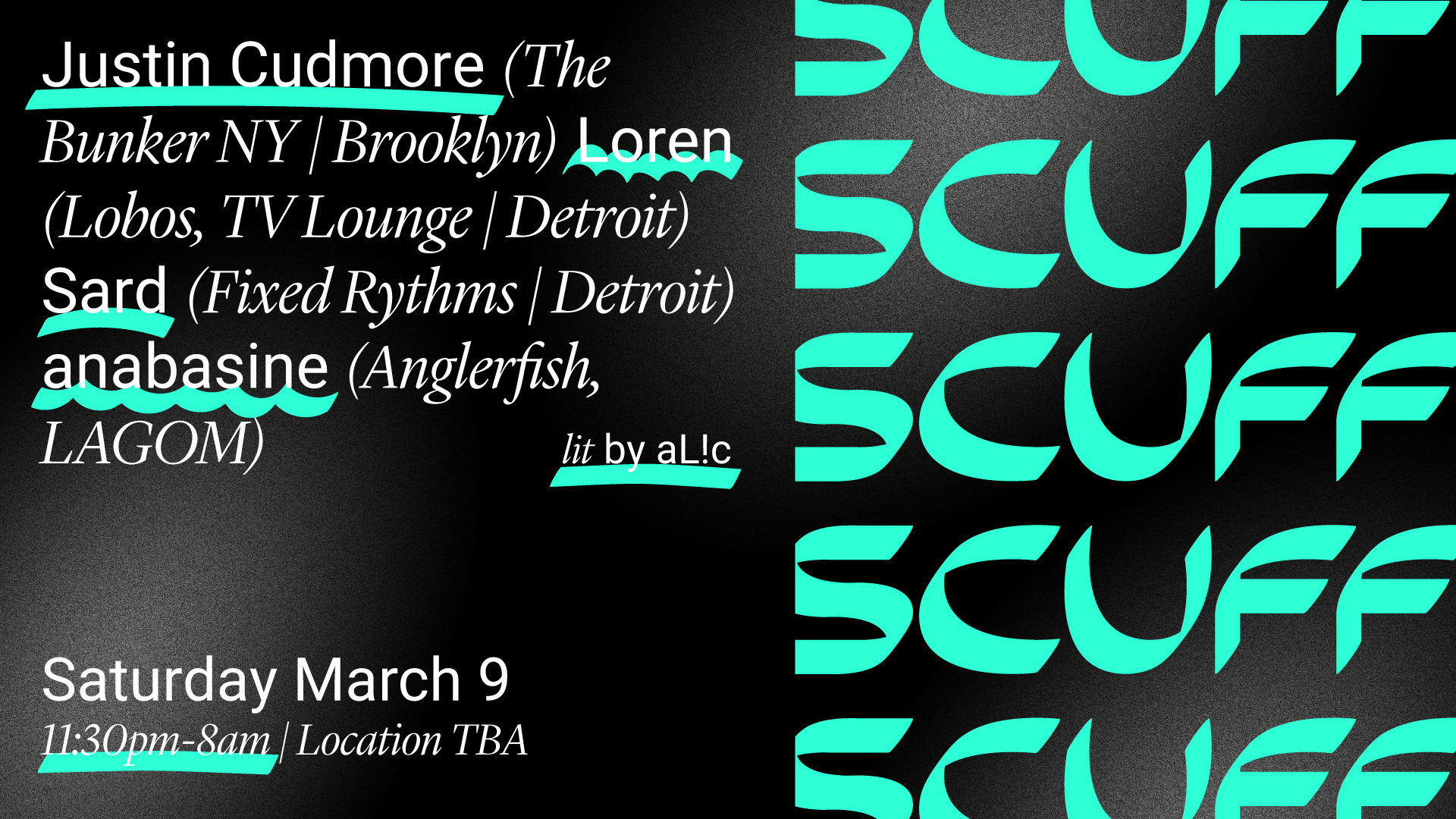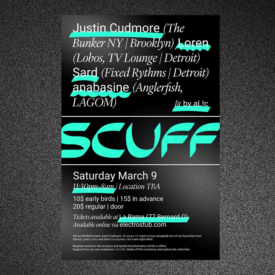 Design direction and branding for the Montreal based underground party series SCUFF. SCUFF is a reoccurring party hosted in Montreal, featuring world rounded electronic artists and acts. This flyer is for the March 2019 edition.